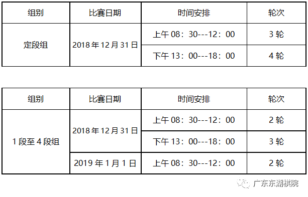 (3)定段组每轮比赛单方用时规定30分钟,1-4段组每轮比赛单方用时规定45分钟,根据比赛进程裁判可中途加钟限时,超时判负。迟到15分钟作弃权论,对手获胜。