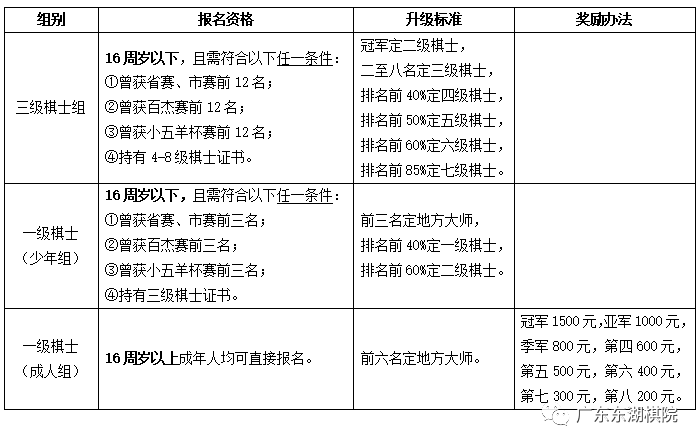 报名方法:选手请携带级位证书,自行前往东湖棋院各网点报名;外地选手请关注微信公众号(gddhqy)参阅(外地选手报名需知)。报名截止日期2018年12月23日,逾期不予接受。一经报名,非棋院原因不得退费。