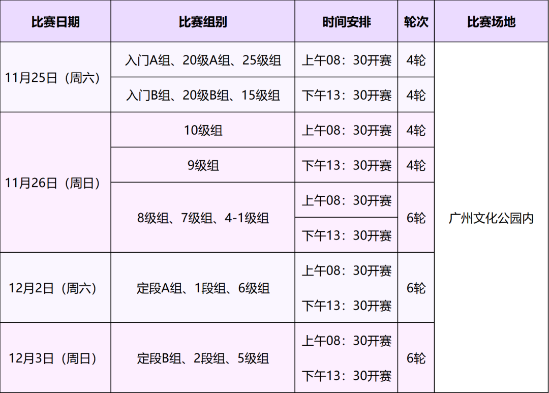 (6)本次比赛定级升级赛仅限14周岁以下选手参加,定段升段赛仅限18周岁以下选手参加。如选手在赛场有扰乱秩序、伤害他人身体等行为,将上报广东省围棋协会,严重者将暂停参赛资格一年。