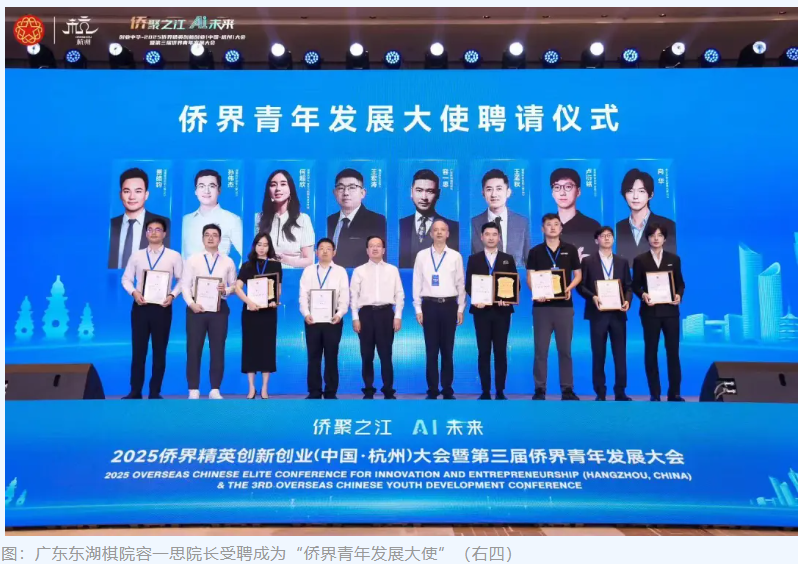 在当日举行的2025侨界精英创新创业(中国·杭州)大会暨第三届侨界青年发展大会上,容一思收获了双重肯定:不仅入选第三届侨界青年发展大会榜单人物,更受聘成为“侨界青年发展大使”。