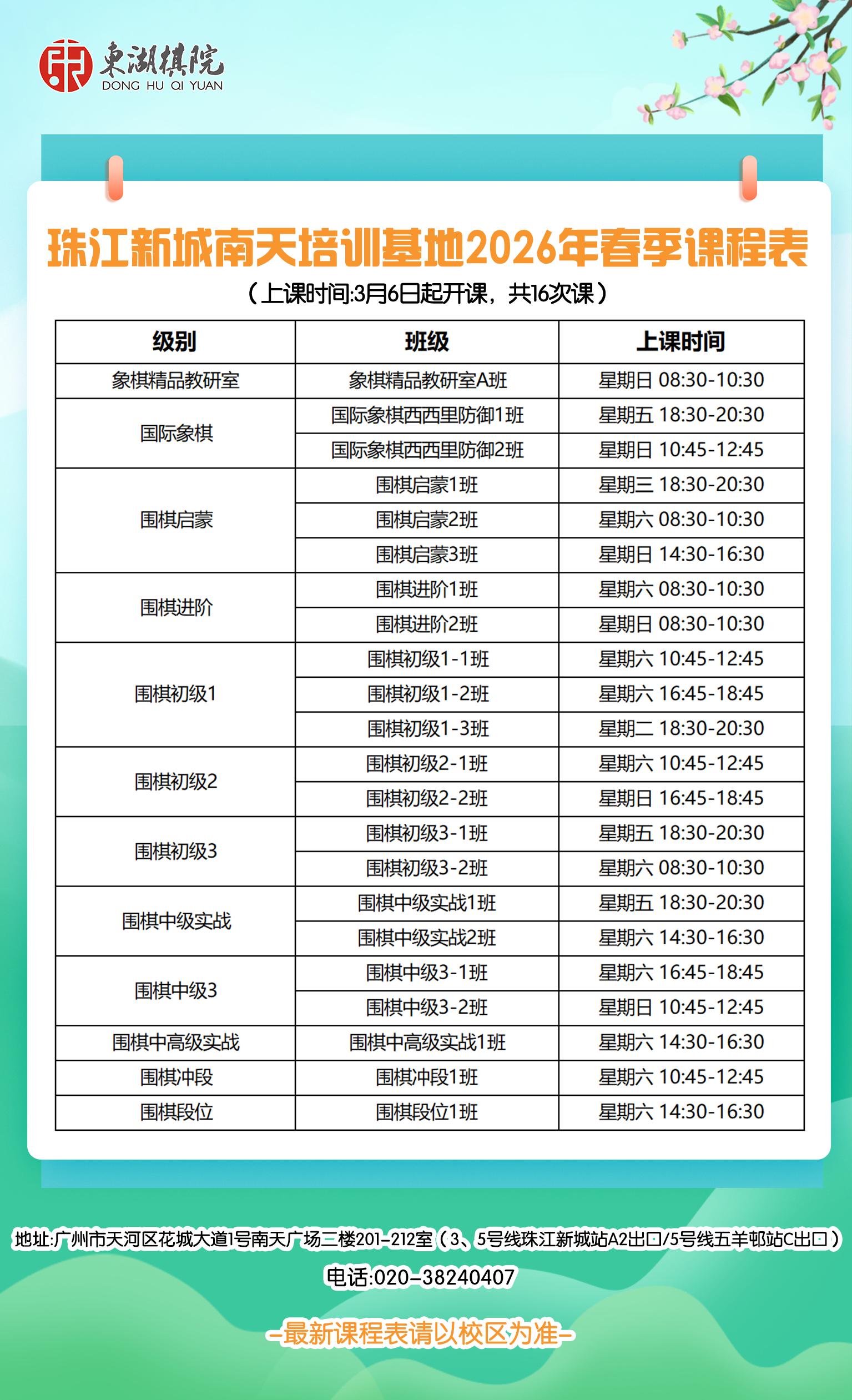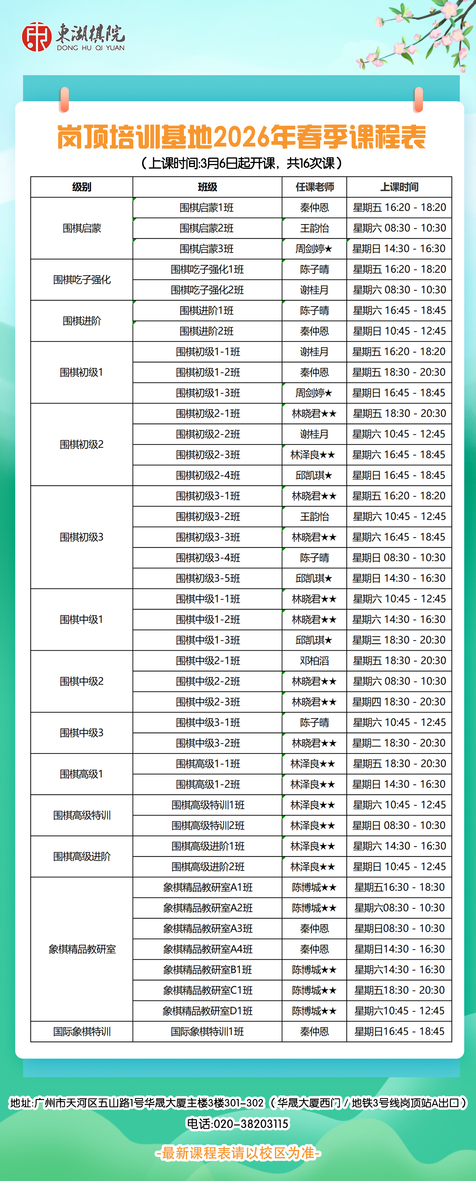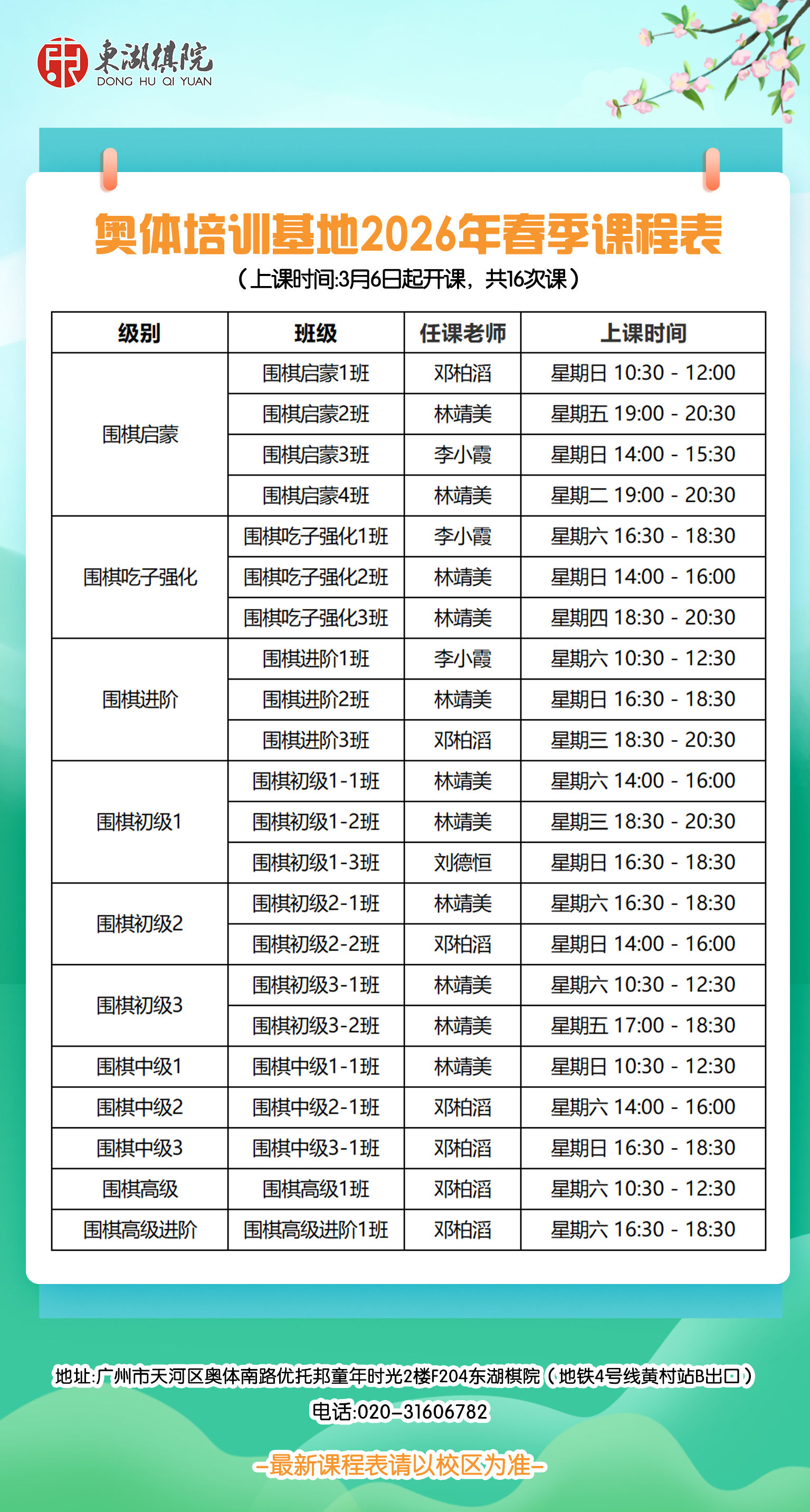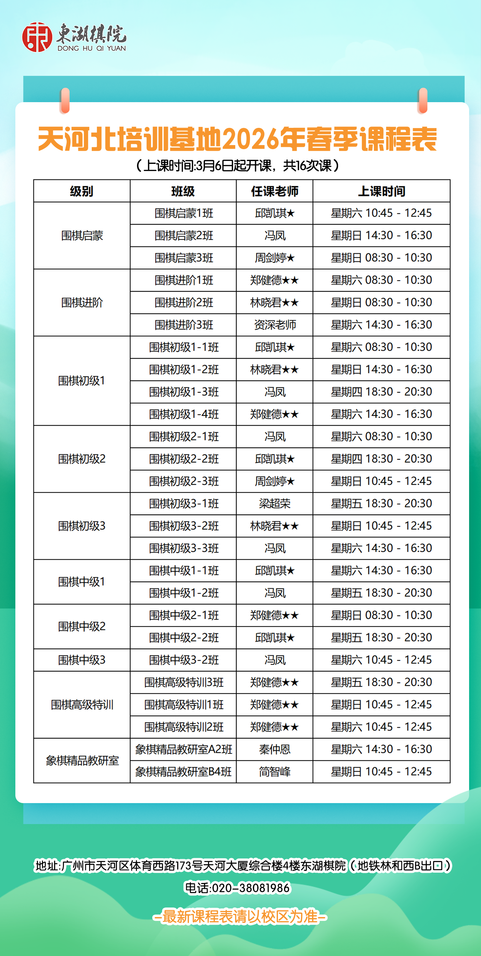 【天河区】岗顶、珠江新城、天河北、奥体培训基地2026年春季班课程表