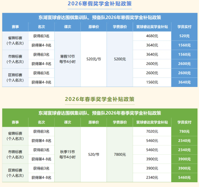 2026年寒假、春季班及招生福利政策将依据学员在2024-2025年指定省、市、区级赛事中的成绩及报读情况,提供相应补贴。