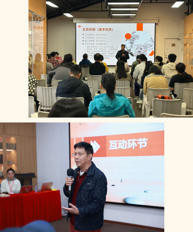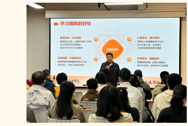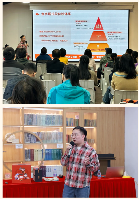 随后,吴树浩四段系统介绍了东湖睿达围棋集训队的课堂特色。他详细解读了集训队独特的金字塔式段位班体系,通过展示名师亲授、赛事护航、资源宝库开放和内部加练循环赛制四大亮点,让家长们对集训队的培养模式有了全面认识,为现场家长勾勒出一条清晰、专业的围棋进阶之路。