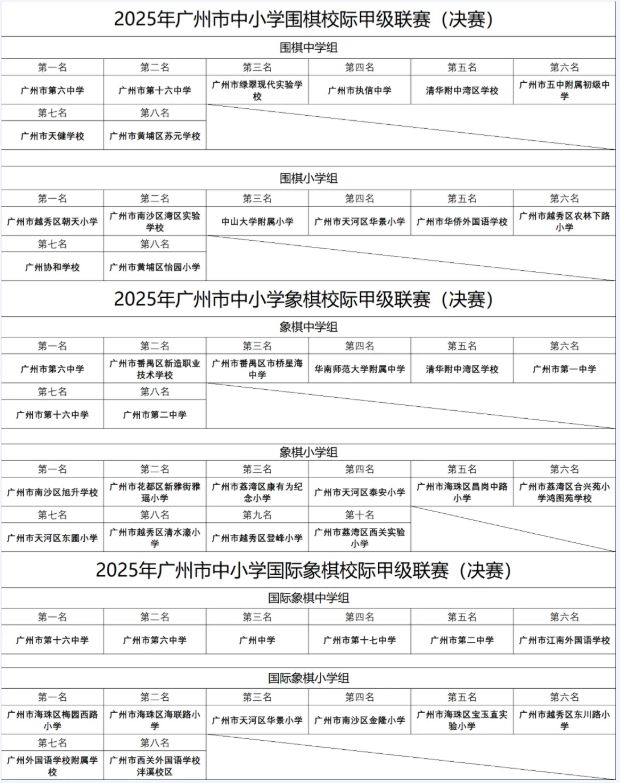 广州市中小学围棋、象棋、国际象棋校际甲级联赛(决赛)成绩名单