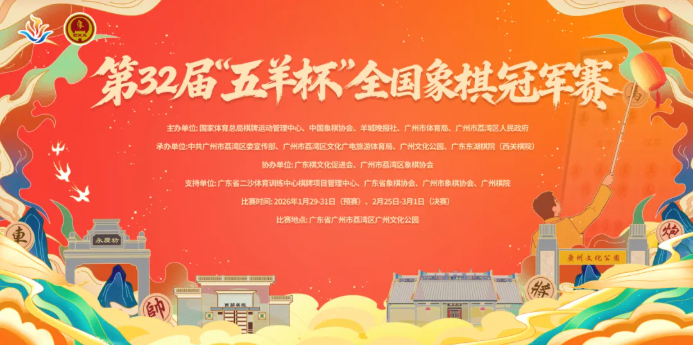 作为中国象棋界的经典赛事,第32届“五羊杯”全国象棋冠军赛(以下简称“五羊杯”)将于明年初在广州市荔湾区广州文化公园燃起战火。作为中国象棋协会新赛事体系下的首个A级赛事,2026年“五羊杯”迎来多项重磅升级,赛制革新、外卡强援、女子高手、港澳台棋手齐聚羊城,将为全国棋迷呈现一场兼具传统底蕴与创新活力的象棋盛宴。