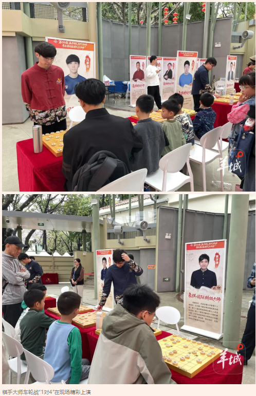 棋手大师车轮战“1对4”也在现场精彩上演,棋友与象棋大师们楚河对弈、切磋棋艺,在方寸棋盘间展现精湛棋艺。